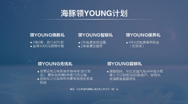 为了减轻年轻用户的购车压力,为首批海豚用户提供更多福利,比亚迪特别推出“海豚领YOUNG计划”。自预售开启之日起,截止至海豚正式上市当日(含),预订海豚的用户可享受包括“2年0息,首付40%起”“至高4,000元置换补贴”在内的多重权益大礼,通过比亚迪汽车APP或小程序下订的前5,000名客户,更有机会抽取盲盒赢好礼。