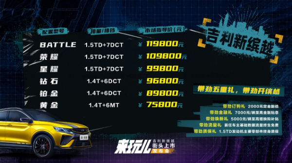 为了让年轻人轻松拥有科技新潮的专属座驾,新缤越最大化客户权益,带来五重带劲大礼:2000元定金翻倍带劲订购礼、7000元/辆至高金融贴息带劲金融礼、5000元/辆至高增换购补贴带劲焕新礼、首任车主基础数据流量终生免费带劲流量礼和1.5TD发动机主要零部件终身质保的带劲质保礼。