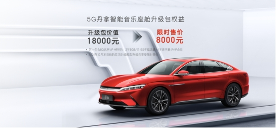 8月29日,比亚迪携DiLink 4.0(5G)和为汉EV四驱高性能版旗舰型倾力打造的“5G丹拿智能音乐座舱”升级包,在成都车展正式上市。“5G丹拿智能音乐座舱”升级包包含5G速联、HiFi级定制丹拿音响、DiLink 4.0(5G)、双频定位导航技术四大升级,售价18000元。用户在12月31日前完成购车,可享8000元抵18000元优惠,并获赠5G优享VIP畅听包。