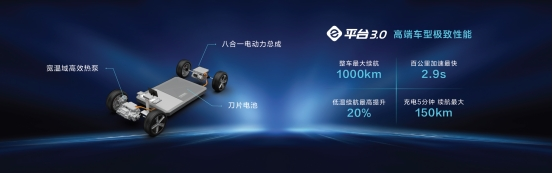 在高效上,e平台3.0通过标配全球首创的八合一电动力总成,最大行驶里程突破1000km;电驱升压快充技术可实现充电5分钟,最大行驶里程达150km;动力电池直冷直热技术可将热效率最大提升20%,并降低能量损耗;宽温域高效热泵系统可打破传统热管理系统分立的边界,也可充分利用环境、动力总成,甚至乘员舱和动力电池的余热,开源和节流并重,可实现-30℃到60℃的宽域工作温度,将冬季续航里程最大提升20%;全新电四驱动力系统可实现零百加速快至2.9秒,让用户在享受四驱电动车的高性能的同时,仅消耗两驱车的能耗。