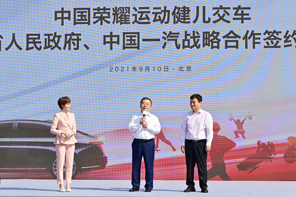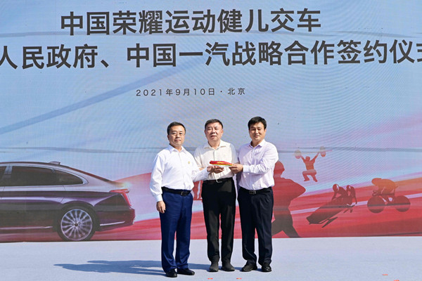 9月10日,“中国荣耀运动健儿交车暨国家体育总局、吉林省人民政府、中国一汽战略合作签约仪式暨雪车装备交付仪式”在北京首都体育馆举行。会上,中国一汽与中国航天科技集团联合研发制造的首辆雪车揭幕,并正式交付国家体育总局冬运中心。