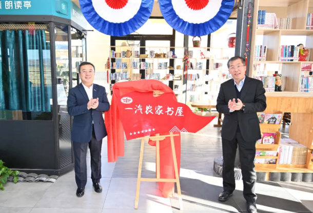 (配图:中国一汽董事、党委副书记王国强为延安村“一汽农家书屋”揭牌)