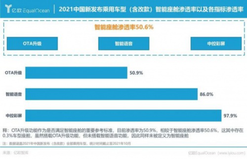 2021年中国新发布乘用车车型显示,智能座舱的渗透率已达到50.6%;其中渗透率最高的车型价位区间为20-25万元,高达58.4%;所有含智能座舱的车辆中,中控彩屏的渗透率高达97.9%。与此同时,在座舱智能化发展过程中,搭载OTA升级功能也越来越普及,OTA渗透率高达50.9%。未来,“硬件提前预埋+软件订阅服务”的新座舱服务也将通过OTA搭载率的提升而逐渐落地。因此,车企若想从激烈的市场竞争中脱颖而出,必须将智能座舱作为重要突破口。