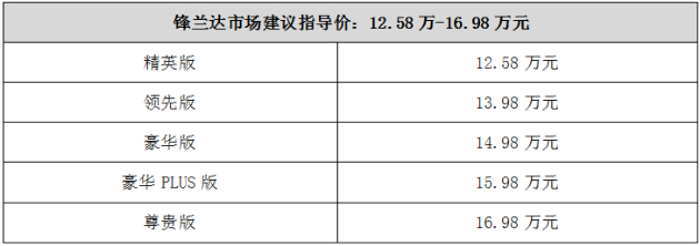 广汽丰田全新TNGA紧凑型SUV锋兰达传承广汽丰田“兰达系列”高价值基因,锋兰达以全面进阶的产品实力,为新世代活力人群及年轻家庭用户带来“锋趣满载”的年轻派优选SUV。新车共推出五款车型,市场建议指导价为12.58万-16.98万元。