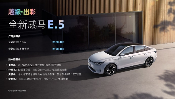 此次威马带来两款车型,分别是全新威马E.5 Pro和全新威马E.5 智客行。Pro版综合补贴后售价18.01万元,智客行版综合补贴后售价19.01万元。
