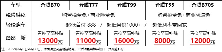 【焕然一新】置换购车享高额补贴,奔腾B70至高补贴13000元、奔腾T77至高补贴11000元、奔腾T99至高补贴16000元、奔腾T55至高补贴8000元、奔腾B70S至高补贴12000元。