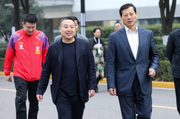 中国男子乒乓球历史上首位集奥运会、世锦赛、世界杯单打冠军于一身的“大满贯”得主刘国梁出现在厂内,他的身后是中国乒乓球协会秘书长兼男队主教练秦志戬、副秘书长何潇、女队主教练李隼,以及队员马龙、丁宁、许昕、樊振东、林高远、刘诗雯、陈梦、孙颖莎等。他们身着红色运动装,走在厂区内,意气昂扬。东风公司董事长、党委书记竺延风热情欢迎他们的到来。