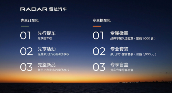 雷达汽车品牌背靠吉利集团,具有研发、生产、采购、销售体系等优质资源,并将基于吉利集团强大的物联网技术,立足“新能源+多元”新赛道,精准布局多元生活市场,并将持续构建“无忧的生活方式”“无界的探索精神”“无痕的环保理念”文化,让用户的户外生活展现多元魅力。