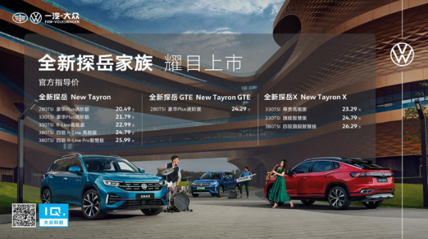 8月23日,一汽-大众全新探岳家族正式上市,包括“进阶高能智慧SUV”全新探岳、Coupe溜背造型全新探岳X以及插电混动全新探岳 GTE,提供1.4T、2.0T标准功率、2.0T高功率、插电混动共9款车型,官方指导价格区间为20.49万元-26.29万元。