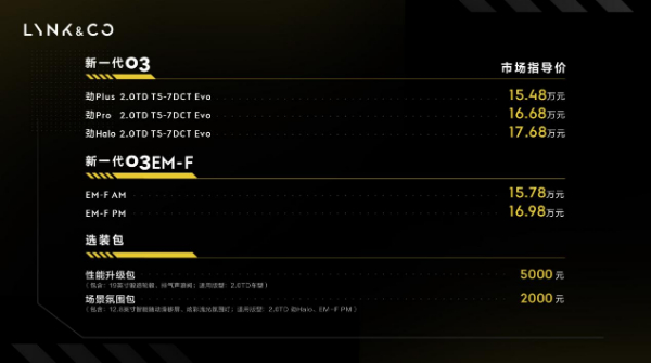 另外,新一代03 提供5000元的性能升级包和2000元的场景氛围包。前者包括19英寸锻造轮毂和排气声浪阀,适用范围为2.0TD车型;后者包含12.8英寸智能随动滑移屏和炫彩流光氛围灯,适用版型为2.0TD 劲Halo、03EM-F PM。