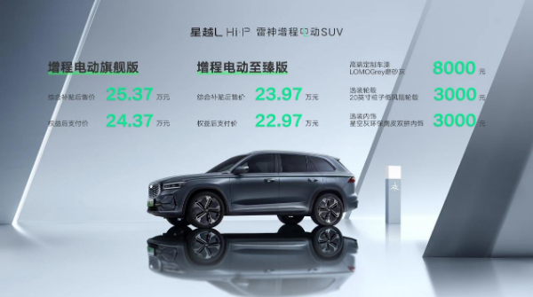11月25日,星越L Hi·P雷神增程电动SUV正式上市。新车共推出2款车型,增程电动旗舰版,综合补贴后售价25.37万元,权益后支付价24.37万元;增程电动至臻版,综合补贴后售价23.97万元,权益后支付价22.97万元。其中,高端定制车漆LOMOGrey磨砂灰,售价8000元;选装轮毂20英寸粒子低风阻轮毂,售价3000元;选装内饰星空灰环保麂皮双拼内饰,售价3000元。