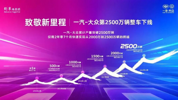 一汽-大众在克服多重挑战的同时,用时2年7个月实现了从2000万辆到2500万辆的跨越。