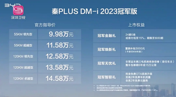 日前,比亚迪秦PLUS DM-i 2023冠军版正式上市,新车共推出55KM领先型、55KM超越型、120KM领先型、120KM超越型、120KM卓越型五款车型,官方指导售价分别为9.98万元、11.58万元、12.58万元、13.58万元、14.58万元。其中55KM领先型更是让比亚迪DM-i车型价格首次下探至10万元以内。作为年度改款车型,新车主要在内饰与配置方面进行优化升级,并增加外观和内饰配色选择。