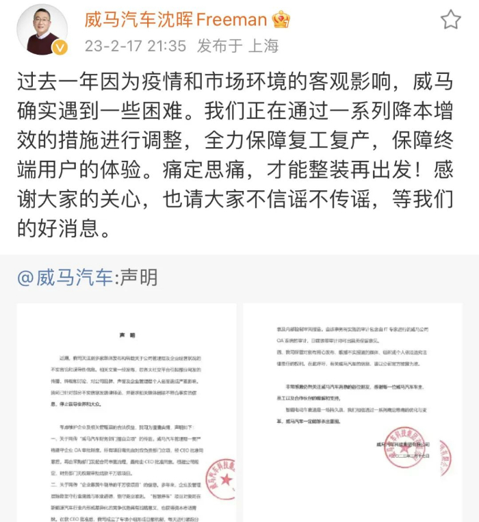 威马汽车创始人、董事长兼CEO沈晖转发上述微博表示:“过去一年因为疫情和市场环境的客观影响,威马确实遇到一些困难。我们正在通过一系列降本增效的措施进行调整,全力保障复工复产,保障终端用户的体验。痛定思痛,才能整装再出发!感谢大家的关心,也请大家不信谣不传谣,等我们的好消息。”