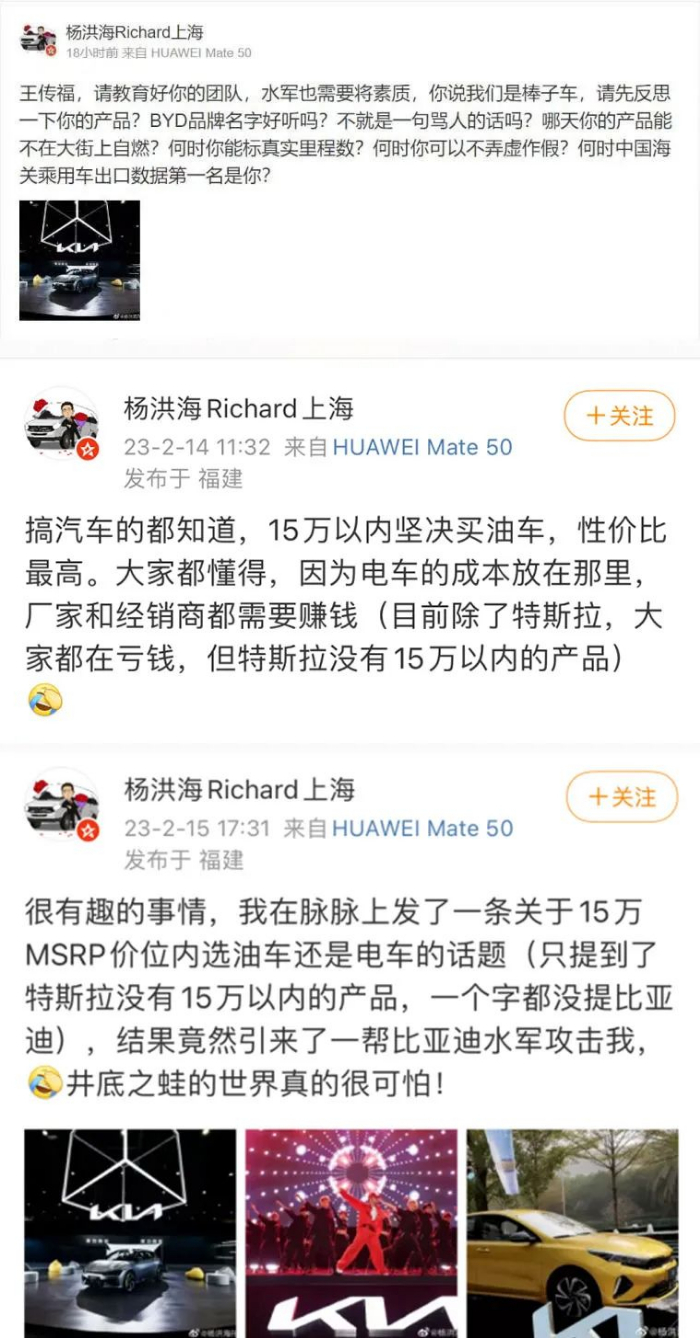 “王传福,请教育好你的团队,水军也需要将(讲)素质,你说我们是棒子车,请先反思一下你的产品?BYD品牌名字好听吗?……”2月17日晚,起亚中国首席运营官(COO)杨洪海的一条微博震动中国汽车行业。