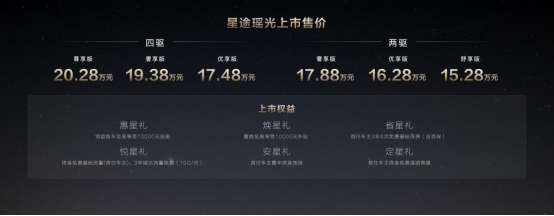 2月21日,“智慧轻奢旗舰SUV”星途瑶光正式上市。新车共推出400T TGDI两驱、400T TGDI四驱两种车型共6个型号,售价区间为15.28-20.28万元。