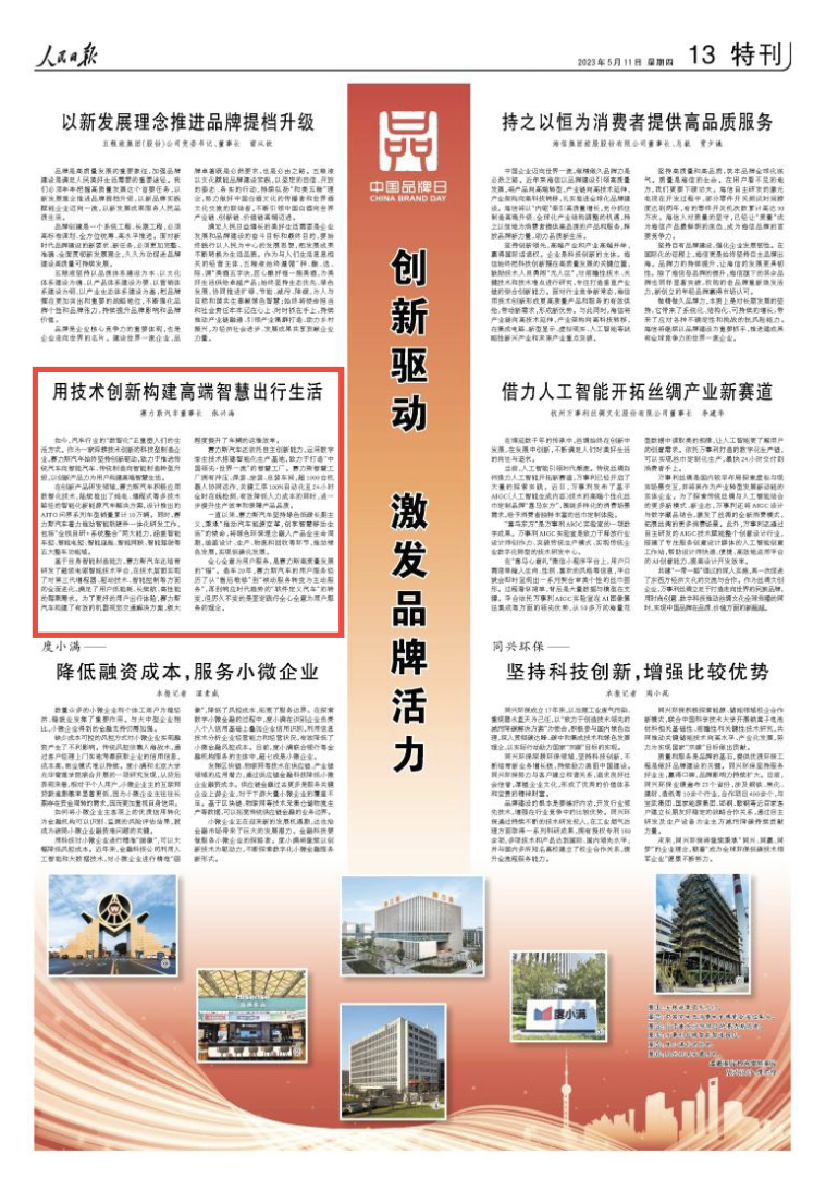 5月11日,人民日报刊发中国品牌日系列主题文章《驱动创新 激发品牌活力》,其中,赛力斯汽车董事长张兴海以“用技术创新构建高端智慧出行生活”为主题,介绍了企业发挥创新引领,推动高质量发展的生动实践。内容如下: