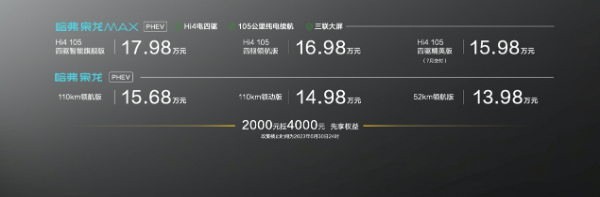 5月15日,哈弗品牌新能源之夜暨哈弗枭龙系列上市发布会在北京举行,正式发布哈弗品牌全新新能源战略,推出全新新能源产品——哈弗枭龙系列,其官方指导价为13.98万-17.98万元。针对订购用户,哈弗还推出了上市尊享7重礼,为用户带来真正价值匹配价格的新能源SUV标杆之作。