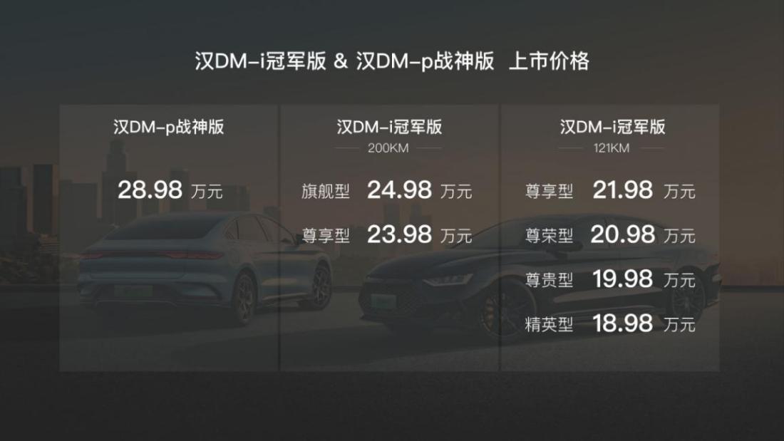 此次,产品实力全面进阶的汉DM系列两款车型中,汉DM-i冠军版的价格区间为18.98万元—24.98万元,汉DM-p战神版的价格为28.98万元。此外,全新汉DM系列还为用户准备了5大智联在线服务、5大专属贵宾服务、2大无忧购车政策等多重购车礼遇。