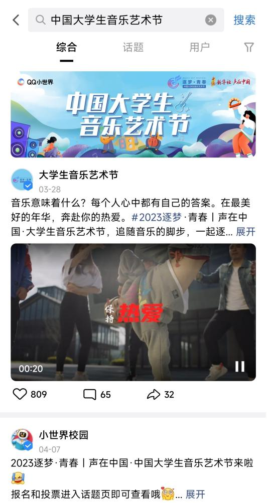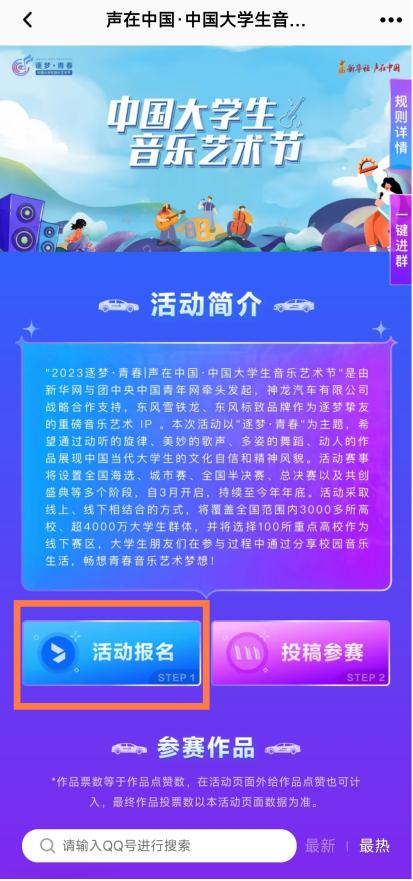 在QQ小世界内搜索“中国大学生音乐艺术节”即可搜索到活动页面。