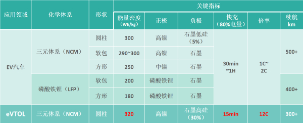 新能源汽车动力电池与eVTOL电池技术指标对比