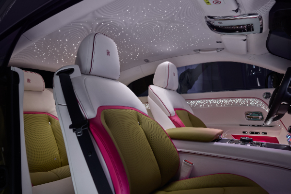 作为对劳斯莱斯经典设计现代化演绎的重要一环,耀目的光线元素令闪灵每时每刻均熠熠生辉。闪灵车型拥有劳斯莱斯车型中最宽的帕特农神庙前格栅,采用触手如冷玉般的抛光不锈钢材质手工精心打造,上缘与日间行车灯完美齐平,格栅页片角度和照明效果也经过倾心设计,呈现优雅且立体的光感。品鉴活动现场的回廊以莱斯莱斯标志性的星光顶为灵感,由近万根光纤组成浩繁灵动的星簇回廊,闪灵的光幕格栅与之遥相呼应,彷若闪灵以自信无拘的动感姿态快意前行。作为劳斯莱斯首款可提供星光车门定制的量产车型,闪灵车门内饰板中共计4,796 颗柔和星光与星光顶篷和星光面板相互映衬,为灵感源于隽永神秘夜空的星光内饰氛围营造全景璀璨体验。