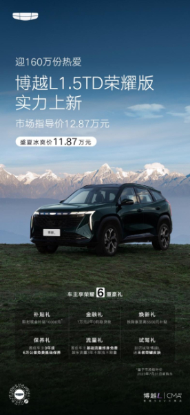 7月9日,在博越家族总销量即将达成160万辆的时刻,博越L通过一场人车接力进行海拔3666米的中国牛背山登顶挑战,在亚洲最大360度观景平台正式发布了新版型——博越L荣耀版,官方指导价12.87万元。用户在7月31日前选购博越L荣耀版,还可享10000元的现金补贴,限时售价仅需11.87万元。除此之外,博越L荣耀版还为用户推出了包含金融礼、焕新礼等在内的多重礼遇。