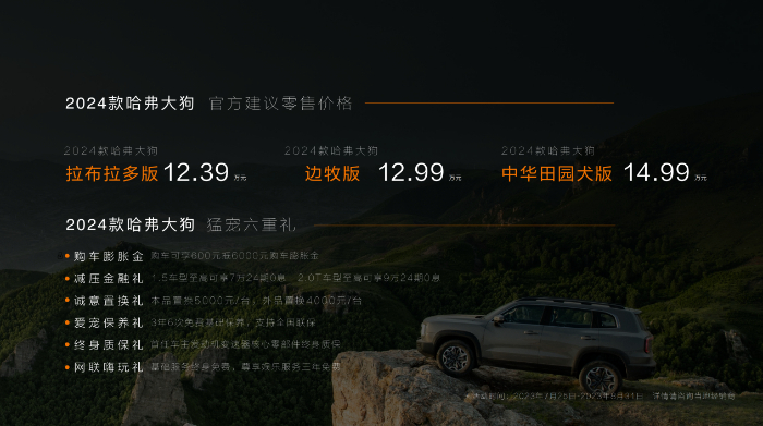 7月25日,2024款哈弗大狗正式上市,新车共推出三款车型。2024款哈弗大狗在外观、动力、智能等方面实力进阶,旨在稳固轻越野赛道产品地位,不断迈向更为广阔的市场蓝海。