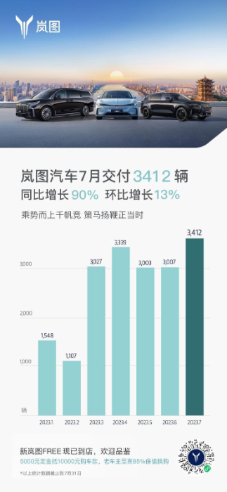 8月1日,岚图汽车公布2023年7月交付数据。2023年7月,岚图交付新车3412辆,同比上涨90%,环比上涨13%。在愈加激烈的市场竞争下,岚图汽车凭借其卓越的产品硬实力,销量连续五个月超3000辆,潜力持续释放。