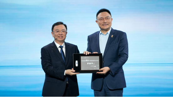 活动现场,王传福向“时间的朋友”跨年演讲主讲人、得到App创始人罗振宇交付比亚迪第500万辆新能源汽车——腾势N7。
