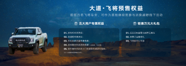 大道·飞将同步开启预售,配备柴汽油 AT 四驱,四款车型,厂商预售指导价格分别为: 飞将汽油无界版 19.98 万元,飞将汽油极境版 21.88 万元;飞将柴油无界版 20.38 万元,飞将柴油 极境版 22.28 万元。