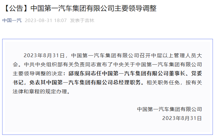 据中国第一汽车集团有限公司微信公号“中国一汽”消息,2023年8月31日,中国第一汽车集团有限公司召开中层以上管理人员大会。中共中央组织部有关负责同志宣布了中央关于中国第一汽车集团有限公司主要领导调整的决定:邱现东同志任中国第一汽车集团有限公司董事长、党委书记,免去其中国第一汽车集团有限公司总经理职务。相关职务任免,按有关法律和章程的规定办理。