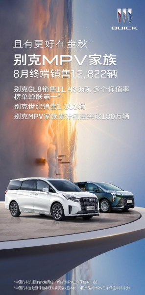 9月1日,上汽通用汽车别克品牌宣布,旗下MPV家族累计销量突破180万辆。8月,别克MPV家族终端销售12,822辆。其中,别克GL8销售11,438辆,今年1-8月累计销量76,870辆;别克世纪CENTURY自去年11月上市以来,迅速赢得消费者的关注与青睐,至今年5月累计销量已突破1万辆。