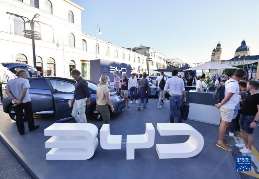 9月5日,人们在德国慕尼黑国际车展的城市公共展示区参观比亚迪汽车。