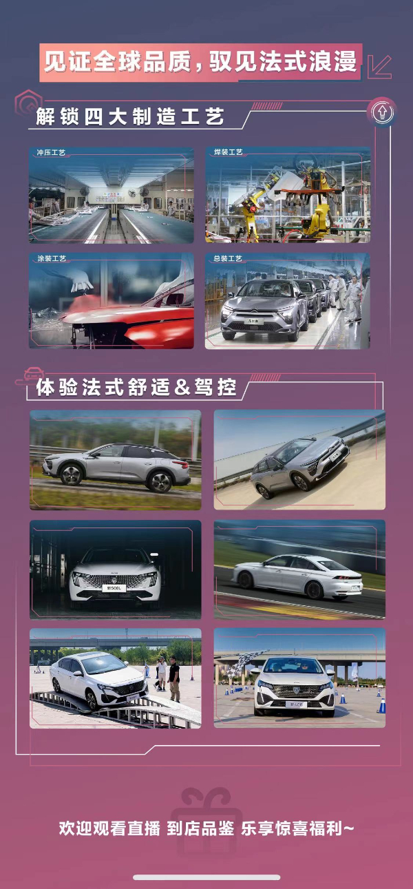 在品质体验场,通过交叉轴、单边桥、8字绕弯等,让客户在不同极限路况下,体验法系车的出色驾控;网络达人场,“李美越”等十余位百万粉丝级的网络达人,将以直播形式,带领消费者沉浸式“云访”生产线,深度溯源神龙汽车“全球品质”的奥秘;直播团购场,超长12天不间断直播全天候覆盖,既有总部、品牌主播和区域TOP级主播全程助力,又有网络媒体“国家队”新华网现场直播,见证“全球品质 神龙制造”,为“良心车 良心价”打call;工厂外销场,凡尔赛C5 X车辆出口现场直播,见证“神龙造全球销”;BOSS福利场,不止有大区BOSS参与直播,为粉丝狂撒福利,更有神龙汽车总部BOSS空降直播间,让粉丝福利再加码。
