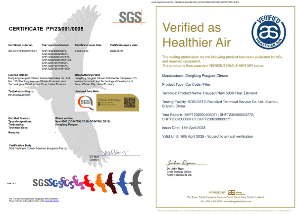 此外,在今年8月的成都车展上,全球公认的质量和诚信基准、全球市值第一、最权威的第三方综合性测试、检验机构——通标标准技术服务有限公司(SGS)为东风标致新5008颁发了汽车行业首个“SGS金标/ASL健康认证证书”。该认证的获得,是“良心车神龙造”在追求极致道路上的又一里程碑。