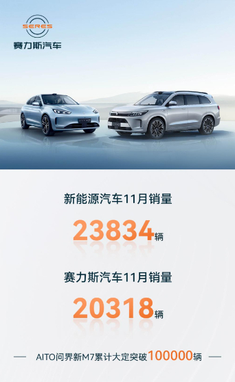 12月1日,赛力斯集团股份有限公司(601127.SH以下简称“赛力斯”)发布11月产销快报。数据显示,11月赛力斯新能源汽车销量达23834辆,同比增长104.39%;其中,赛力斯汽车销量(主要为AITO问界系列)为20318辆,同比增长145.92%,双双创下新高。值得一提的是,11月AITO问界系列共交付新车18827辆,其中AITO问界新M7交付新车15242辆,连续两个月交付破万,累计交付超27000辆。