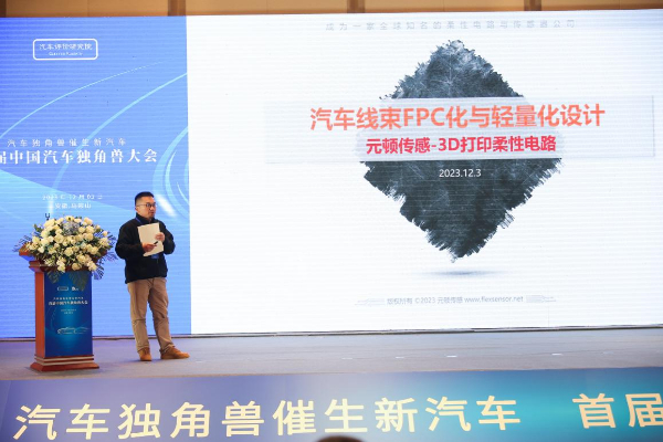 合肥元顿传感科技有限公司董事长、首席技术官刘泽江以《汽车线束FPC化与轻量化设计》为主题向参会嘉宾介绍了该公司对3D打印柔性电路的理解。