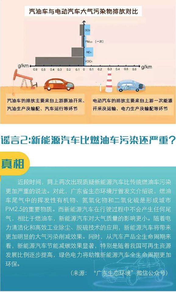 辟谣平台表示,近段时间,网上再次出现质疑新能源汽车比传统燃油车污染更加严重的说法。对此,广东省生态环境厅曾发文介绍说,燃油车尾气中的挥发性有机物、氮氧化物和二氧化硫是形成城市PM2.5的重要物质。而新能源汽车在行驶过程中不会产生任何尾气,相比于燃油车,新能源汽车对大气质量的影响更小。同时,随着电力清洁化和高效工业除尘、脱硫技术的应用,新能源汽车将带来更加明显的大气污染削减效果。