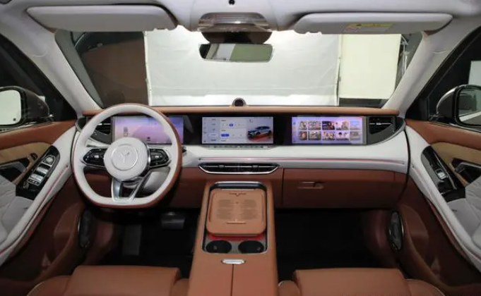 进入到车内,通过这几块大屏便能发现,这台车的内饰非常注重科技氛围的打造,并且这块三联屏是一体式可升降三联屏,智能又很有仪式感。平底设计的方向盘很符合运动 SUV 的定位,实体按键的加入让驾驶过程中的操作更加便捷。车内大面积都用上了皮质包覆,手感细腻,档次尽显。新车的座椅版型没有过多变化,主流的按摩、通风、加热等功能都具备。