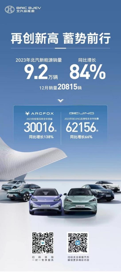 2023年,北汽蓝谷已经积累了增长动力。最新数据显示,北汽蓝谷旗下子公司北汽新能源在2023年12月销售新车20,815台,2023全年销售新车92,172台,同比增长84%,增长势头明显。其中,北汽蓝谷打造的高端智能电动汽车品牌极狐汽车,成为公司销量增长的主要动力源。极狐汽车全系产品在2023年12月销售新车8,004台,2023全年销售新车30,016台,同比增长达138%。