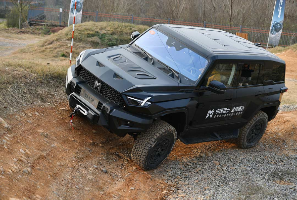 电池位于车辆底盘中部的猛士917在坡道性能试验中充分展现了其侧翻稳定性和强劲的动力,侧翻稳定角达到44.3度,最终试验结果显示,车辆能在90%的坡度上,发挥持续稳定的动力输出。值得一提的是,电池包与车架梁一体化设计是猛士917的一大亮点。