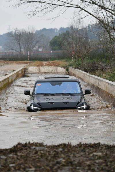 驾驶实战方面,除涉水性能测试外,越野性评价测试包含了交叉轴、卵石路、V形沟、凸台路、坡道、滑轮组六项路面考核场景。据介绍,此次涉水测试的深度为900mm,涉水路况最深已经没过了轮胎,底盘的电池包已被水面全部覆盖。测试中,猛士917动力充分保证车辆在水中进退自如,密封性表现良好。