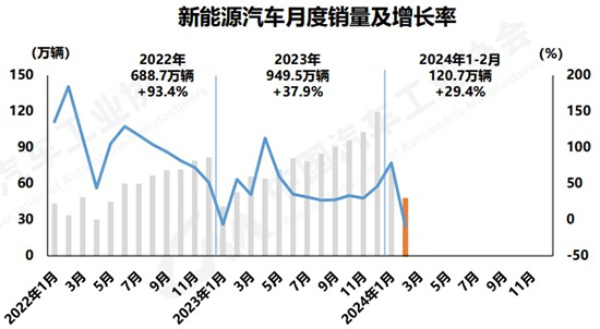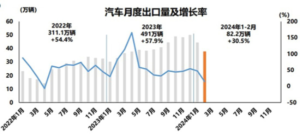 1-2月,新能源汽车产销分别完成125.2万辆和120.7万辆,同比分别增长28.2%和29.4%,市场占有率达到30%;其中新能源汽车出口18.2万辆,同比增长7.5%。“与传统燃油车相比,新能源汽车的出口增速略低。”陈士华说。作为对比,2023年全年,我国新能源汽车出口120.3万辆,同比增长77.6%。