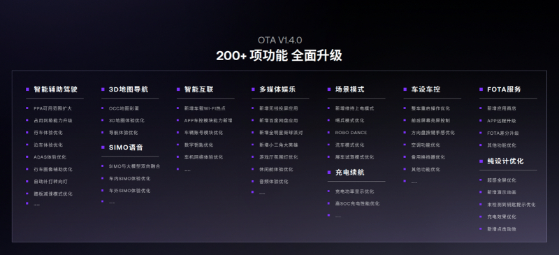 此次OTA升级涉及智能驾驶、智能座舱、智能互联、三电等诸多领域,共计升级200多项功能,解决5300多名用户反馈问题。例如升级OCC占用网络可视化效果、SIMO与文心一言大模型双向融合、基于大模型的人车家生态正式“上车”等。V1.4.0版本将为用户带来更好开、更好用、更好玩的智能出行体验,兑现让用户“月月开新车”的承诺。