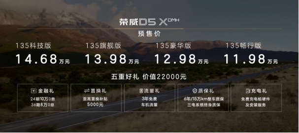 4月25日,“长续航新主流混动SUV”荣威D5X DMH于北京车展开启预售。荣威D5X DMH共推出135畅行版、135豪华版、135旗舰版、135科技版共四个版本车型,预售价格为11.98万元—14.68万元。