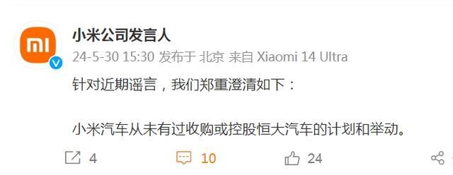 对于市场上小米汽车计划收购恒大汽车的传闻,@小米公司发言人 30日下午发声明称,小米汽车从未有过收购或控股恒大汽车的计划和举动。