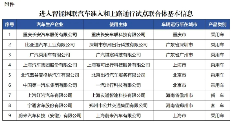 四部门根据专家总体意见,并综合考虑产品类别、车辆运行城市特点、申报的自动驾驶功能、企业测试示范基础等情况,在履行相应程序后,确定首批进入试点的联合体。