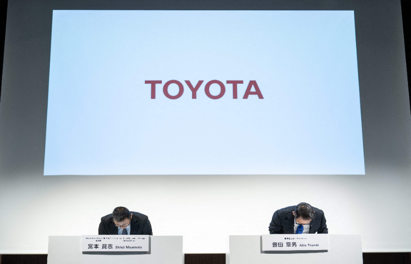 6月3日,丰田汽车公司会长(董事长)丰田章男(右)在东京召开的记者会上鞠躬道歉。新华社/法新