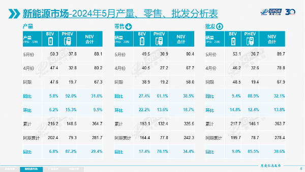 据乘联会分析,5月份国民经济运行平稳,虽然受节假日错月、上年同期基数较高等因素影响,但随着国家“以旧换新”的政策落地实施、北京车展拉动消费热情、各地相应政策措施出台与跟进,加之车市新品价格战阶段性降温,保价回购政策进一步打消用户顾虑,头部企业的重磅产品发布带动产品供给稳定预期,前期市场观望群体的消费热情被激发,5月全国新能源乘用车市场进入相对较好的发展阶段。